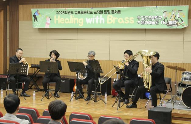 이번 교직원 힐링 콘서트 ‘Healing with Brass’는 김포 늘봄학교 활성화에 기여한 바 있는 문화예술단체 ‘The 울림’의 전문 관악 연주팀을 학교로 초청하여 Brass 밴드가 연주하는 걸포초 교직원을 위한 다양한 장르의 음악을 감상하며 교직원들의 몸과 마음의 힐링 시간을 가졌다.