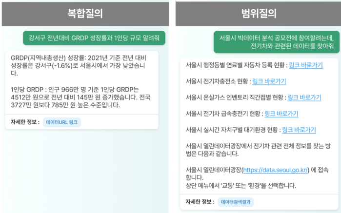 또 “서울에 사는 외국인의 행복지수는 어떻게 되지?”, “자치구별 지역내총생산 규모를 알려줘”와 같이 서울서베이, 서울 지역내총생산 등 ▴통계치 기반 정보나 “강서구 전년 대비 지역내총생산 성장률과 1인당 규모는 얼마인가?”와 같은 ▴복합 질문도 가능하다.
