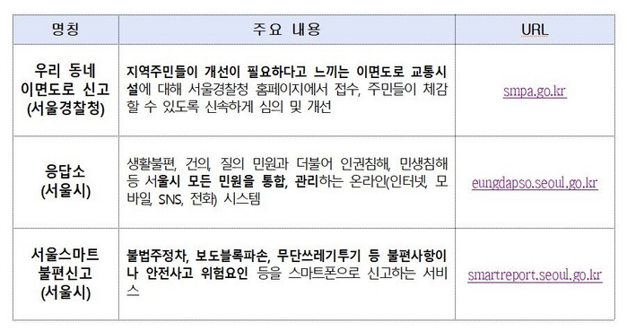 이곳에서 시민들은 ‘응답소’, ‘서울스마트불편신고’와 서울경찰청의 ‘우리동네 이면도로 신고’ 중에서 교통불편 사항별로 선택해 신고할 수 있다.