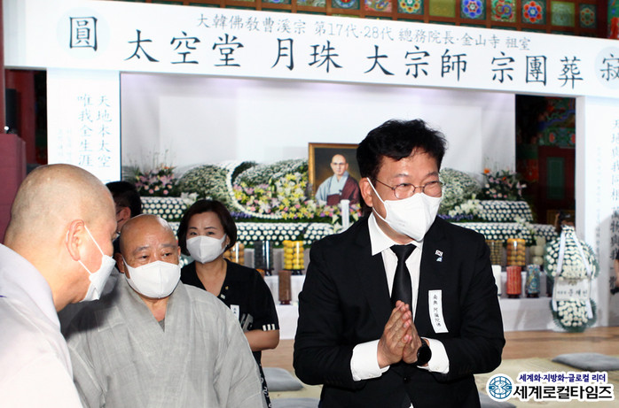 [세계로컬타임즈 글·사진 조주연 기자] 더불어민주당 송영길 당대표가 25일 오전, 전북 김제 금산사를 찾아 조계종 전 총무원장 월주(月珠)스님을 조문한뒤 스님들과 인사를 나누고 있다. 송 대표는 방명록에 “월주 큰스님의 깨달음의 사회화 운동 철학을 계승 발전해 가겠습니다”라고 적었다.