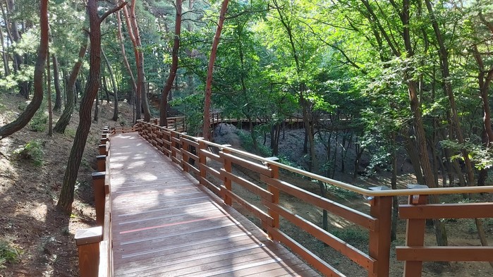 새롭게 조성된 무장애 나눔길은 4억 9,000만 원의 예산을 들여 데크로드 430m, 황토포장 140m, 보행 매트 150m 구간 등으로 조성됐다. 앞서 지난해 한국산림복지진흥원 녹색자금 공모사업으로 조성된 나눔길 데크로드 600m와 순환형으로 연결된다.