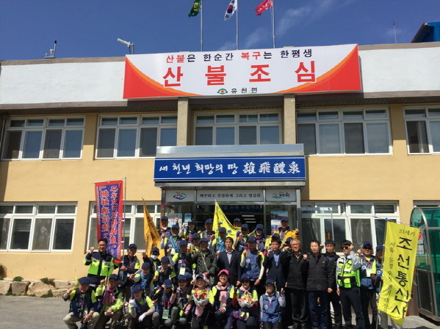 | ▲ 조선통신사 옛길 한·일 우정걷기 참가자들이 경북 예천군 유천면사무소를 방문해 기념촬영하고 있다.<사진제공=예천군청> |