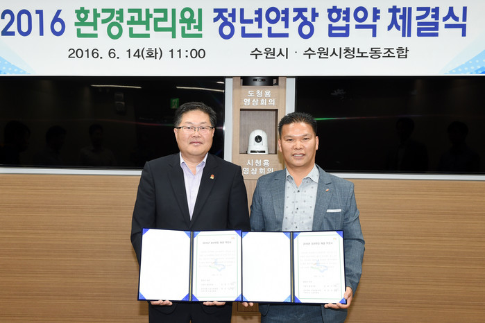 ▲ 14일 오전 수원시청에서 민병구 환경국장(왼쪽)과 최호진 수원시청 노동조합 위원장이 2016년 환경관리원 정년연장 협약을 체결한 후 기 념촬영하고 있다. <사진제공=수원시청> |