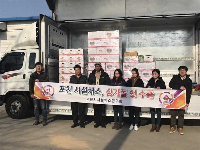 | ▲ 포펀시시설채소연구회 회원 등이 16일 싱가포르에 수출할 채소를 차량에 실은 뒤 기념촬영하고 있다.<사진제공=포천시청> |