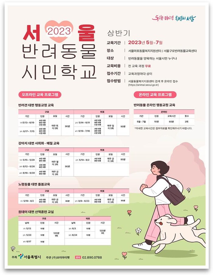 ‘서울 반려동물 시민학교’ 신청은 서울시동물복지지원센터 누리집에서 25일부터 할 수 있으며 선착순으로 접수 마감한다.