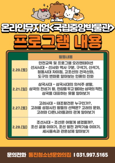 [세계로컬타임즈 최종일 기자] 김포시청소년재단 통진청소년문화의집은 코로나19로 밖으로 나가기 어려운 지금, 현장체험학습 1기 ‘온라인 뮤지엄 <국립중앙박물관>’을 운영한다. 현장형 비대면프로그램에 참여한 청소년들이 함께 박물관 여행의 현장감과 생동감을 느끼며 흥미로운 역사 배움 등이 진행된다.