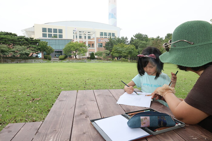| ▲ 미술작가와 함께 참여한 어린이가 스케치 활동을 하고 있다. [사진=인천환경공단] |