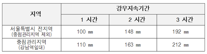 기존 시간당 최대 95mm에서 침수에 취약한 강남역 일대는 시간당 110mm로, 그밖에 다른 지역은 시간당 최대 100mm로 한층 높였다.