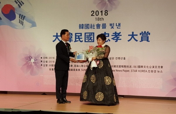 이날 2018년 한국사회를 빛낸 충효대상 조직위원회 대회 총재 대한민국 신문기자협회 명예회장 김상천, 대회장 대한민국 신문기자협회 회장 이용도씨가 수여했다.