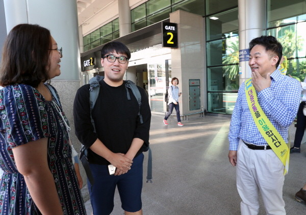 | ▲ 원희룡 제주도지사가 제주공항에서 도민들과 대중교통 전면개편 사항에 대해 이야기를 나누고 있다.<사진제공=제주도청> |