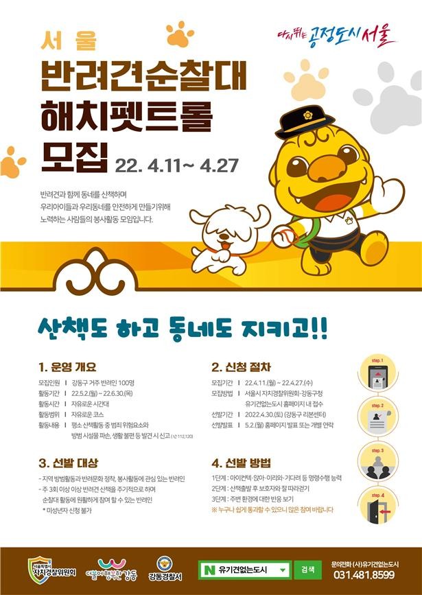 참여 신청은 서울시자치경찰위원회 및 강동구 홈페이지를 통해 온라인 접수하면 된다. 강동구 소재 ‘리본 센터’ 반려견 교육 수료자 및 유기견 입양자를 우선선발하고 일정한 심사를 통과한 일반 모집 신청자 등 총 100명을 선발해 운영한다.