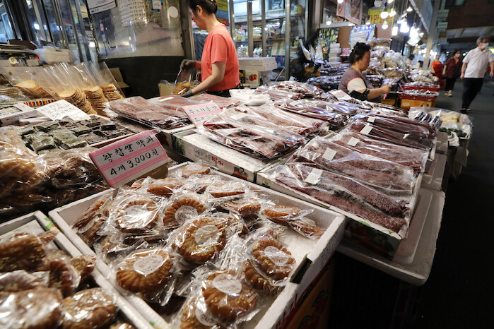 ▲ 24일 오후 서울 종로구 광장시장에 약과와 육포 등이 진열돼 있다. 이날 한국물가정보가 발표한 '추석 차례상 품목 구입 비용(4인 가구 기준)'에 따르면 전통시장에서 구입할 때 비용은 30만1,000원으로 지난 추석보다 2만6,500원(9.7%) 더 드는 것으로 집계됐다. (사진=뉴시스) |