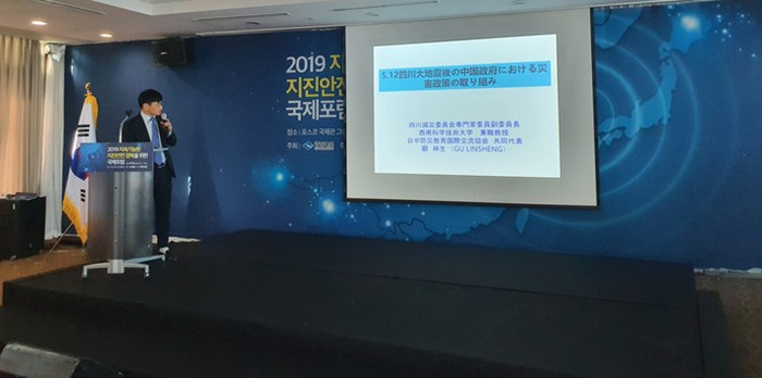 | ▲구린성 서남과기대학 교수(중국)가 '5.12 쓰촨 대지진 후 중국 정부의 재해정책'에 대해 발표하고 있다.(사진=경북도 제공) |