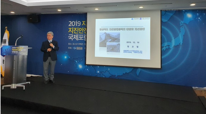 | ▲정교철 안동대 교수가 '경상북도 지진방재정책의 현황과 개선방안'에 대해 포럼을 진행하고 있다.(사진=경북도 제공) |