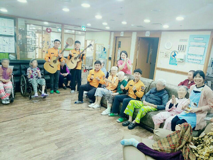 | ▲ 남양주소방서 백봉산 통기타 동호회 회원들이 이레실버케어 노인전문요양원에서 위문공연을 공연하고 있다.<사진제공=남양주소방서> |
