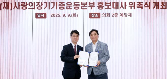 [세계로컬타임즈] 경기도의회 교육기획위원회 소속 김호겸 도의원(국민의힘, 수원5)이 9월 9일 ‘장기기증의 날’을 맞아 재단법인 사랑의 장기기증운동본부 홍보대사로 위촉됐다.