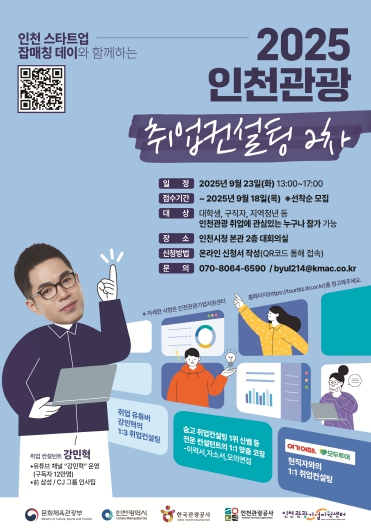[세계로컬타임즈] 인천광역시와 인천관광공사(사장 백현)는 오는 9월 23일 인천시청 본관 2층 대회의실에서 관광 분야 구직자의 취업 경쟁력 강화를 위한‘2025 인천관광 취업컨설팅(2차)’을 진행한다고 밝혔다.