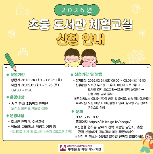 모집은 서구 관내 초등학교를 대상으로 하며, 서구도서관 누리집에서 2월 25일부터 학급 단위로 신청할 수 있다.
