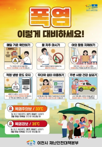 아울러, 이천시는 올해 폭염 저감 시설을 확충하고 취약계층에 폭염 물품을 지원하는 폭염 종합대책을 지난 5월 수립하여 추진하고 있으며, 예경보시설, 재해문자전광판 등 재난 홍보 수단을 통해 폭염 국민행동요령을 집중적으로 홍보하고 있다.