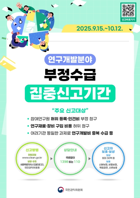 이번 집중신고기간 실시에 따라 참여연구원 허위 등록, 연구개발비 과다 청구 및 중복 수급 등 연구개발 분야 정부지원금 부정수급 신고를 하려는 사람은 누구든지 청렴포털 또는 방문‧우편을 통해 신고할 수 있다.