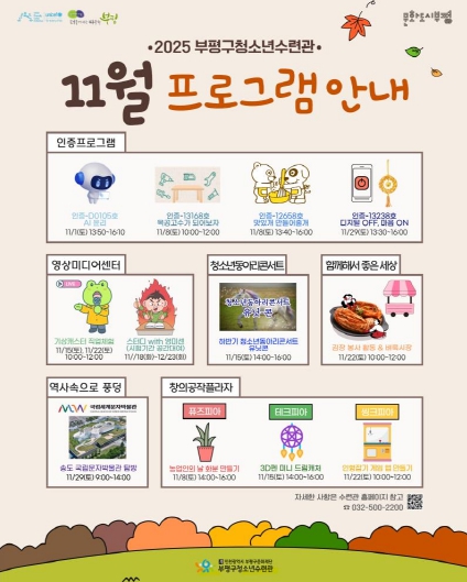 이 밖에도 다양한 프로그램이 열리며, 자세한 내용은 부평구청소년수련관 누리집 또는 카카오톡 플러스친구를 등록해 소식을 받으면 된다.