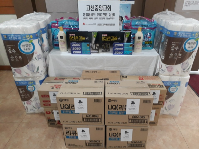 | ▲ 경기도 의왕시 오전동 소재 고천중앙교회가 지난 15일 오전동 주민센터에 기부한 생필품 세트. |