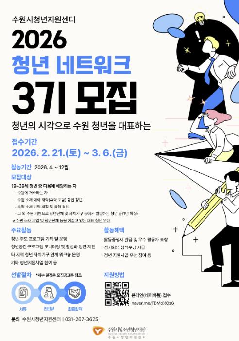 센터 관계자는 “청년 네트워크는 청년이 주체가 되어 직접 기획하고 실행해 볼 수 있는 경험의 장”이라며 “수원을 기반으로 활동하는 다양한 청년들의 많은 관심과 참여를 바란다.”라고 밝혔다.