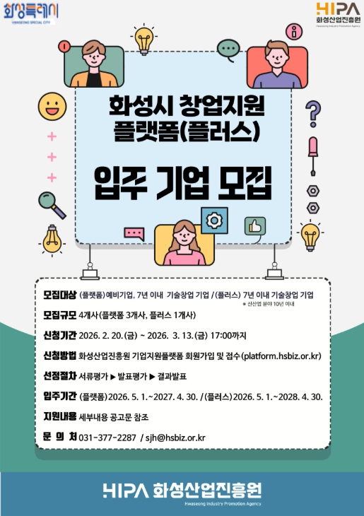 신청은 화성시 기업지원플랫폼을 통해 가능하며, 창업지원플랫폼과 창업지원플랫폼 플러스 간의 중복 지원은 불가하다.
