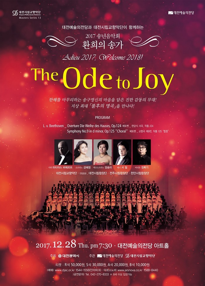 대전시립교향악단 관계자는 "1년에 한 번 밖에 무대에 올릴 수 없고 들을 수 없는 대전시립교향악단이 선사하는 베토벤 교향곡과 함께 한 해를 마무리하고 새로운 희망의 2018년을 기대하는 감동적인 시간을 함께 하시기 바란다"고 말했다.