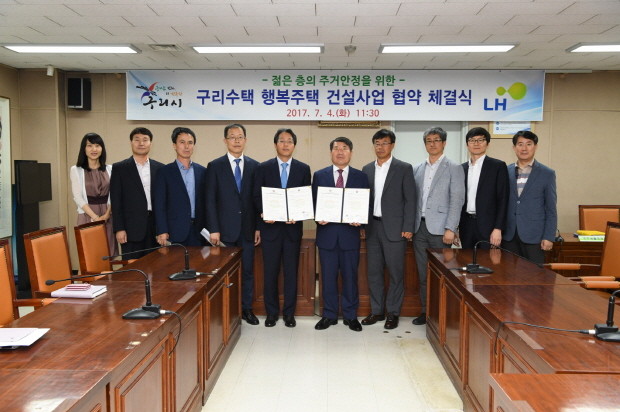 [세계로컬신문 고성철 기자] 경기도 구리시(시장 백경현)와 LH서울지역본부(본부장 김상엽)가 4일 구리시청 상황실에서 ‘구리수택 공공임대주택인 행복주택에 관한 건설사업 협약'을 체결했다.