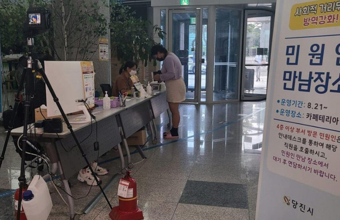 | ▲당진시는 추석 명절을 앞두고 축산물 위생 특별점검을 실시한다. 사진은 당진시청 방문객을 대상으로 열체크 등 방역활동을 하고 있는 모습. (사진=당진시 제공) |