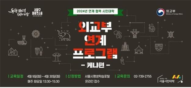 케냐 프로그램은 4월 2일 오전 10시부터 서울시평생학습포털에서 선착순 접수를 시작한다. 그동안 쉽게 알 수 없었던 아프리카 대륙 국가인 케냐의 지역적 특성과 역사, 문화 체험 등 다양한 주제를 깊이 있게 다룬다.