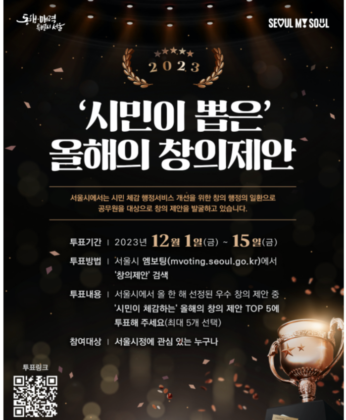 ‘올해의 창의제안 TOP 5’ 시민투표는 서울시 엠보팅 누리집에서 참여 가능하며, 서울시 홈페이지 배너 및 홍보 포스터의 QR코드를 통해서도 간편하게 투표할 수 있다. 서울시 창의행정에 관심 있는 시민 누구나 투표에 참여할 수 있다.