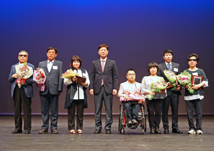 | ▲ 장애인의 날 기념식에서 장애인 복지 증진에 기여한 모범장애인 7명이 표창패를 받고 기념촬영을 하고 있다. |