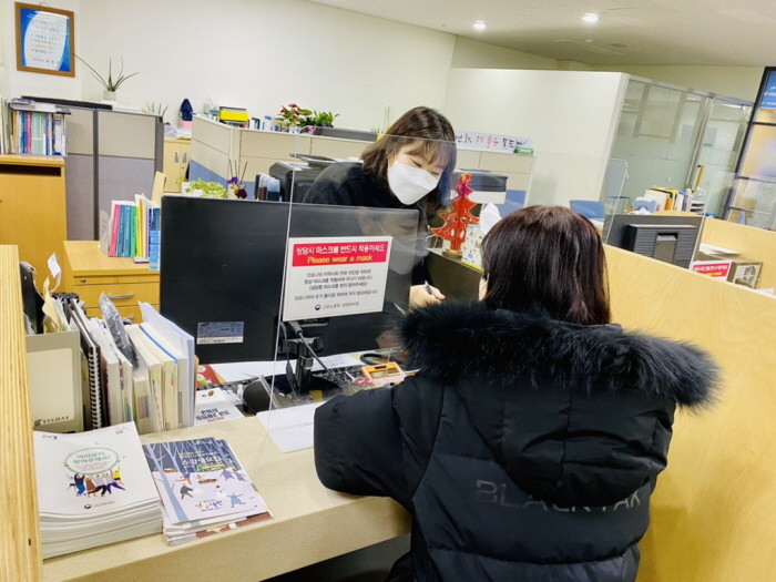 | ▲코로나19 정부지원 사업과 실업급여 등을 신청하기 위해 내방한 시민들에게 긴급지원을 비롯한 사회복지제도를 상세하게 설명하며 소통하고 있다. (사진=동두천시 제공) |