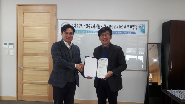 | ▲ 9일 구리남양주교육지원청 교육장실에서 이상욱 교육장(오른쪽)은 한국평화교육훈련원 이재영 원장과 업무협약 체결을 하고있다. <사진제공=구리남양주교육지원청> |