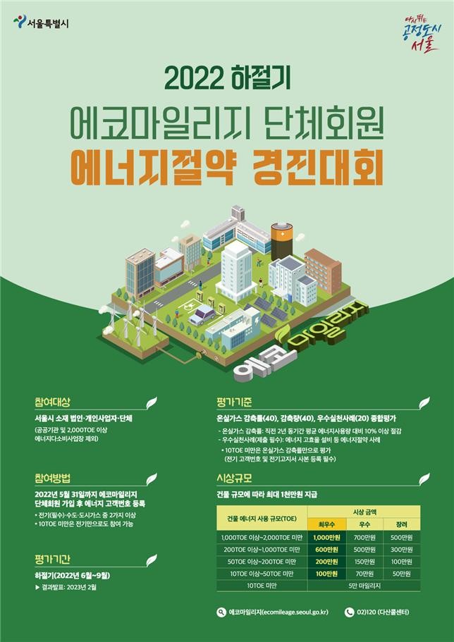 에코마일리지에 가입한 서울시 소재 법인‧개인사업자‧단체를 대상으로 에너지 사용 규모에 따라 최대 1,000만 원의 상금을 지급한다.