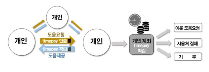 다른 회원에게 도움을 제공하면 활동시간 만큼 시간화폐(Timepay, 타임페이)를 적립하고, 적립된 시간화폐는 다른 사람으로부터 도움을 받을 때 사용하는 방식이다.