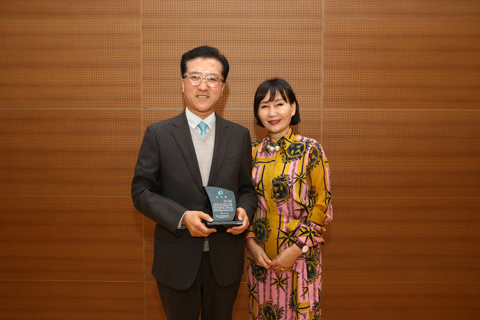 | ▲조원휘 대전시의회 부의장(왼쪽)은 (사)한국어린이집총연합회 가정분과위원회 이라 위원장과 감사패를 들고 기념촬영하고 있다. |