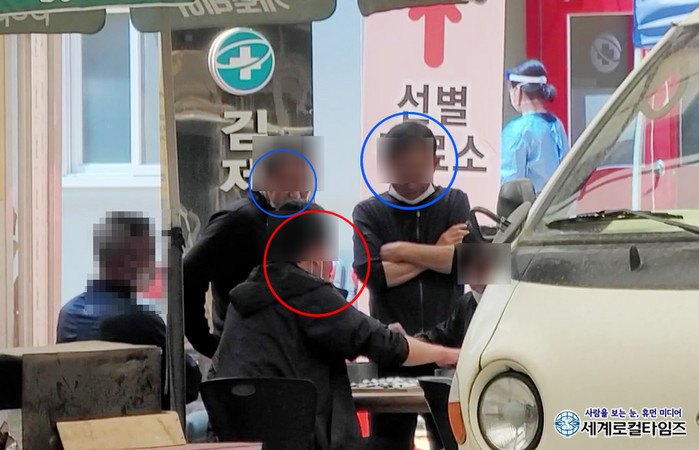 | ▲22일 오전, 김제시 선별진료소 바로 앞에서 마스크를 벗고(파란원) 담배(붉은원)를 피우며 바둑을 두는 사람들 |