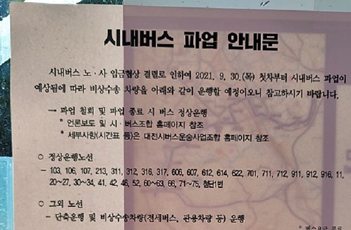 | ▲ 대전시 시내버스가 14년 만에 멈춰선 가운데, 30일 오전 대전 중구 한 정류장에 파업 관련 안내문이 붙어 있다.(사진=뉴시스) |