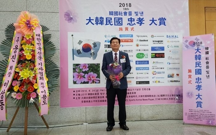 이날 2018년 한국사회를 빛낸 충효대상 조직위원회 대회총재 대한민국 신문기자협회 명예회장 김상천, 대회장 대한민국 신문기자협회 회장 이용도씨가 수여했다.