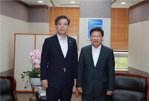 ▲ 권선택 대전시장(오른쪽)이 27일 송언석 기획재정부 2차관을 만나 주요현안 국비사업에 대해 정부지원을 요청한 뒤 기념촬영하고 있다. <사진제공=대전시청> |