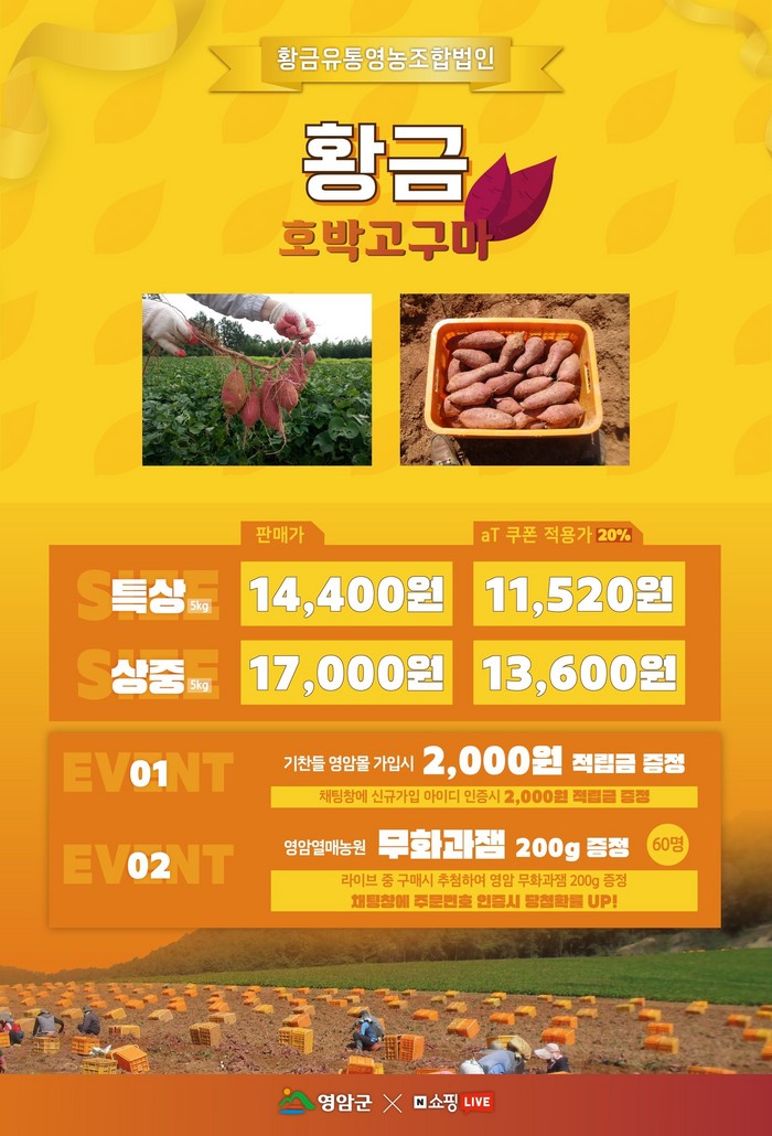 이번 라이브커머스는 유명 트로트 가수인 김다나와 장초롱 리포터가 출연해 진행하며 영암고구마 생산현장을 이원연결해 소비자에게 신뢰감을 높이고 소비자와 소통하는 다양한 게임, 이벤트 등을 실시한다.