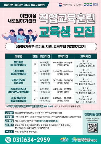 올해 이천새일센터 직업교육훈련 프로그램은 ▲통합돌봄매니저 양성과정 ▲스마트회계실무자 양성과정 ▲도배전문기술 창업과정 ▲공동주택관리소 ERP실무자 양성과정 ▲청소·정리수납 통합서비스과정 등 총 5개 과정으로 운영된다.