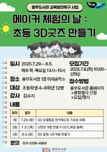 강의 신청은 7월 8일 오전 10시부터 풍무도서관 홈페이지를 통해 가능하며, 초등학교 4~6학년과 중학교 1~3학년을 대상으로 각각 선착순 12명을 모집한다.