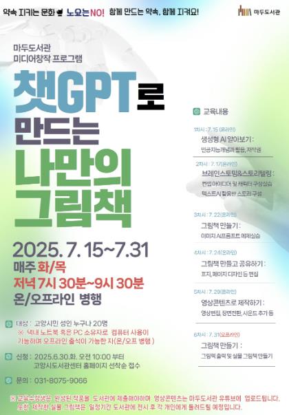 온오프라인으로 총 6회로 진행되는 이 프로그램은 챗지피티(GPT)를 활용한 이야기 구성부터 장면 연출, 그림책 구성까지 전 과정을 체험하며 나만의 그림책을 완성할 수 있다.