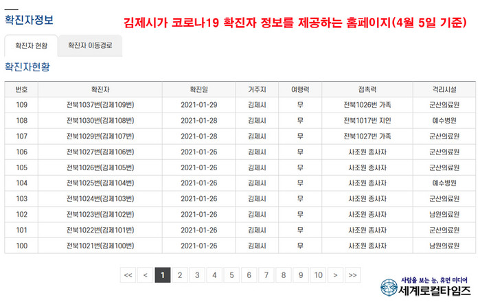 ▲ 전북 1577번(김제 121번) ▲전북 1576번(김제 120번) ▲전북 1030번(김제 119번) ▲전북 1450번(김제 118번) ▲전북 1431번(김제 117번) ▲전북 1398번(김제 116번) ▲전북 1395번(김제 115번) ▲전북 1380번(김제114번) ▲전북 1227번(김제 113번) ▲전북 1162번(김제 112번) ▲ 전북 1150번(김제 111번) ▲전북1128번(김제 110번)▲전북 1078번(김제 109번) 전북1062번(김제108번), 이들이 2월 8일부터 4월 5일까지 발생한 확진자지만 홈페이지에는 공개돼 있지 않았다.