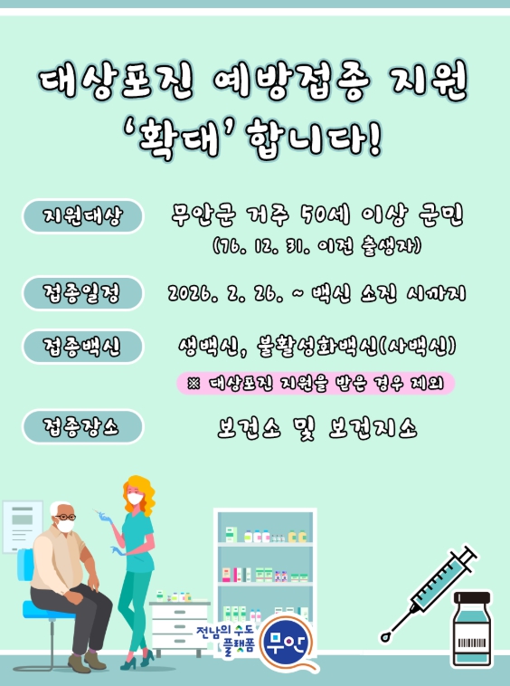 [세계로컬타임즈] 무안군이 오는 23일부터 대상포진 예방접종 지원 대상을 확대한다.
