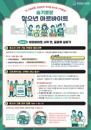 [세계로컬타임즈] 충남교육청은 학기 말 방학을 앞두고 아르바이트 학생의 증가가 예상됨에 따라 일하는 청소년의 권리 보호를 위한‘슬기로운 청소년 아르바이트’ 교육자료를 개발·보급했다.